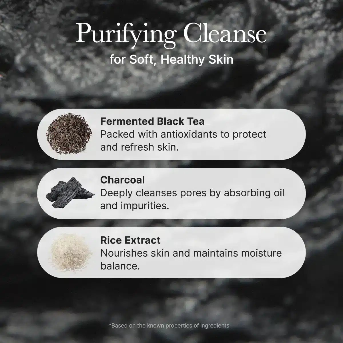 Powered by fermented black tea, charcoal, and rice extract, it deeply cleanses while keeping the skin balanced, soft, and comfortably hydrated—perfect for oily, combination, or congested skin.