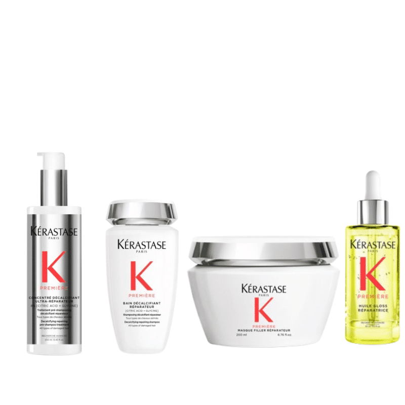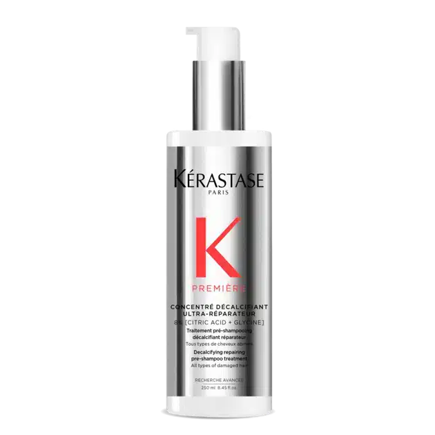 Hard water calcium can accumulate inside the hair, causing dullness, breakage, stiffness, and color fade. The Première collection uses advanced Kérastase decalcifying + repairing technology with citric acid and glycine to remove calcium, smooth the cuticle, strengthen the fibre, and bring softness and shine back to even the most damaged hair.
