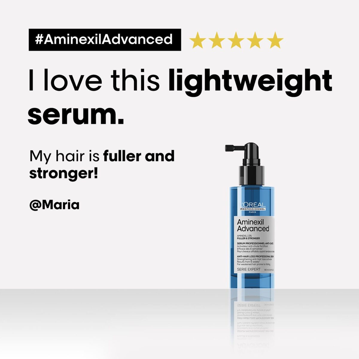 Introducing L’Oréal Professionnel’s Aminexil Advanced anti-hair loss activator serum – an advanced serum to reduce hair loss and get healthy, voluminous hair. Formulated with potent ingredients to strengthen the hair from roots, and reinforce the fiber, giving you +87% stronger hair and appearance of fuller hair.