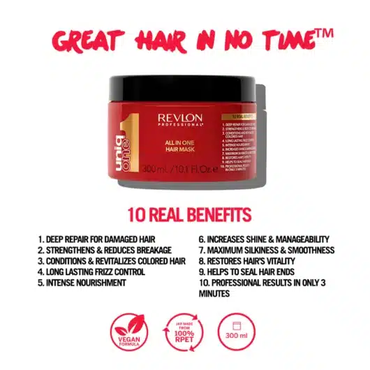 Revive your hair’s beauty with the Revlon Uniq One All In One Mask 300ml, a rich, professional treatment that delivers 10 powerful benefits for complete repair, hydration, and radiance. Designed for all hair types, this intensive mask restores softness, strength, and manageability while leaving hair visibly healthier and smoother after just one use.